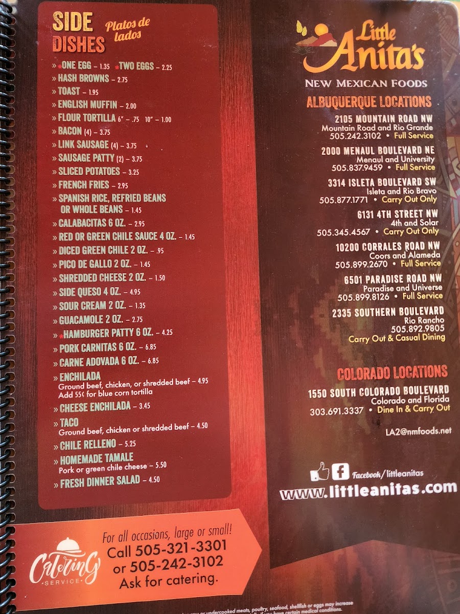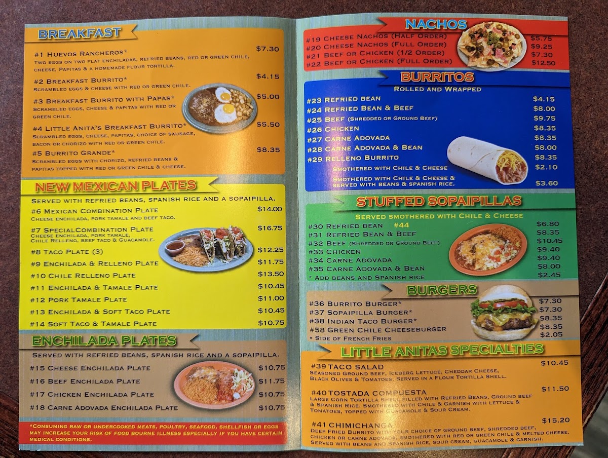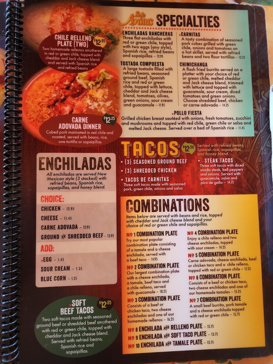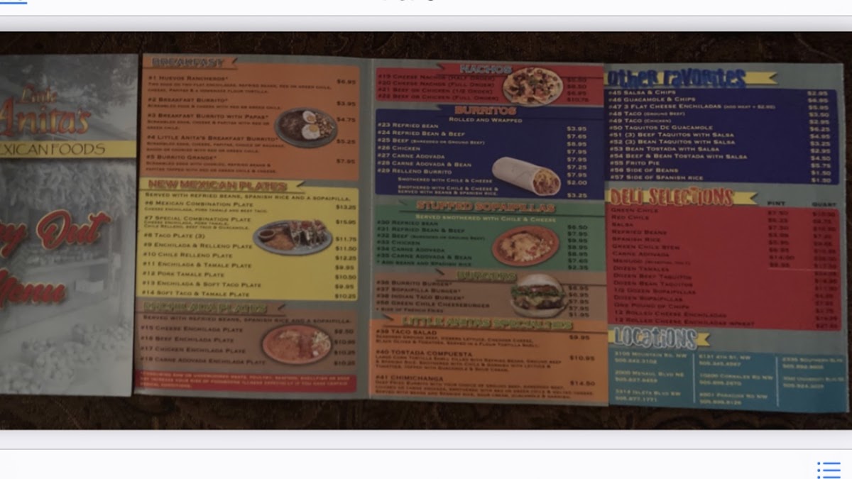 Welcome to Little Anita's New Mexican Food in Albuquerque, a culinary gem that showcases the rich flavors of New Mexican cuisine. Nestled at 6501 Paradise Blvd NW, this cozy spot offers a delightful menu that caters to all palates. Start with their Ensalada De Guacamole—a fresh blend of ripe avocados and tomatoes, served with crispy tostada chips for just $5.50. For something heartier, the Ensalada De Pollo features stove-hot chicken nestled in a flour tortilla shell, topped with cheese and guacamole for $8.50.